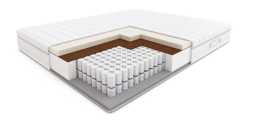 - Wkład 7-strefowa sprężyna kieszeniowa Pocket Plus o wys. 15 cm, po jednej stronie pianka wysokoelastyczna HR o wys. 3 cm, po drugiej włókno kokosowe i blat lateksu o wys. 4 cm